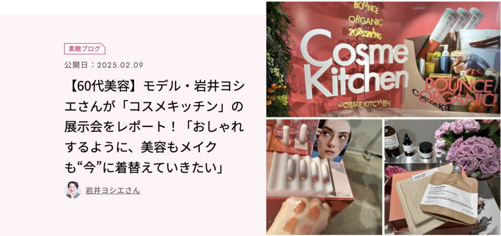 宝島社「素敵なあの人WEB」公式素敵ブログ Vol.5 2025-02-09 最終更新日時 : 2025-02-11 yoshieiwai Vol.5は「コスメキッチン」の展示会について書きました!https://sutekinaanohito.jp/column/15409